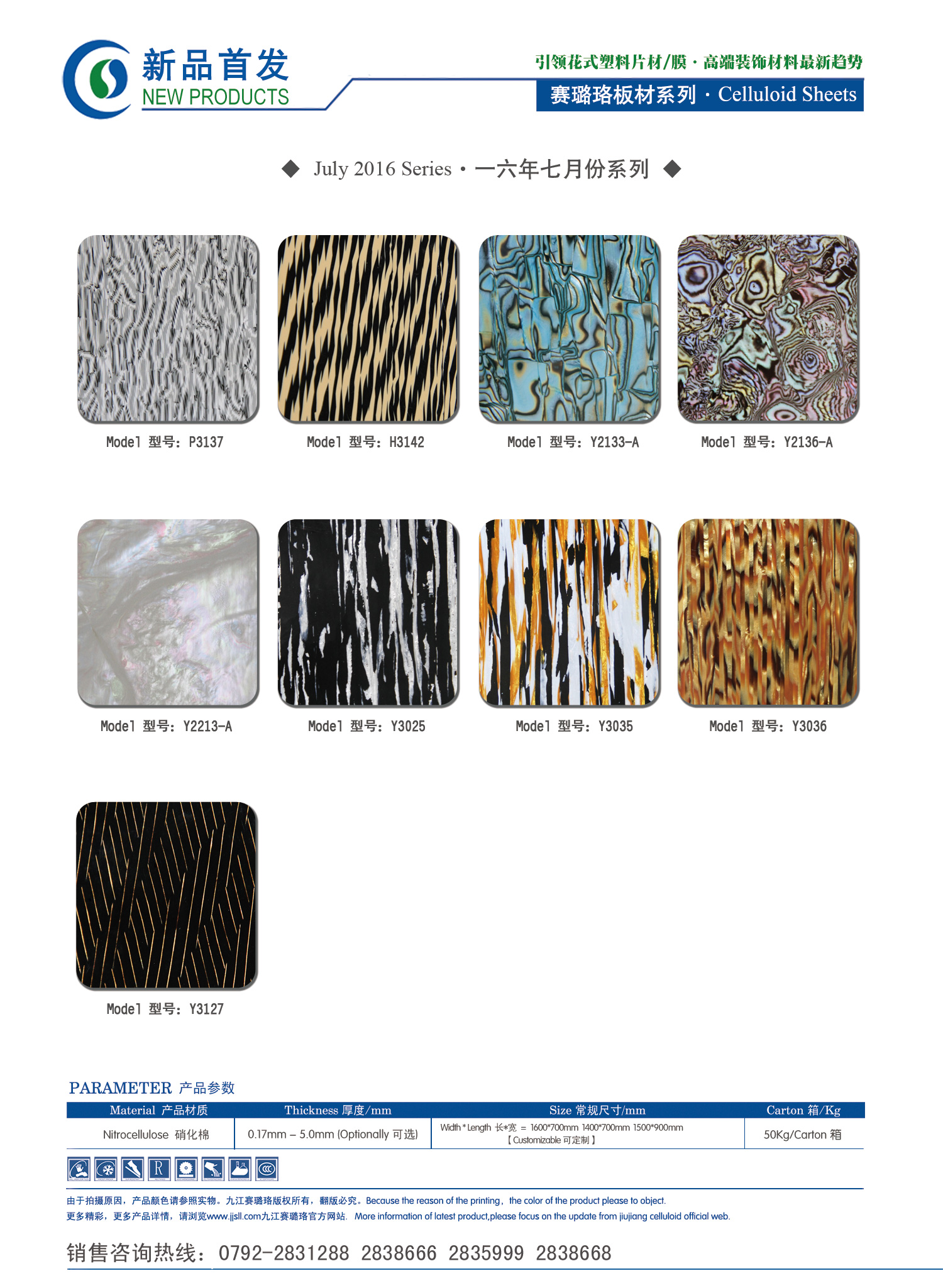 九江賽璐珞實(shí)業(yè)有限公司2016年七月份賽璐珞板材、瑪瑙膜、理石膜、樂(lè)器裝飾材料、花式PVC片材新品發(fā)布,引領(lǐng)花式塑料片材/膜·高端裝飾材料最新趨勢(shì)。咨詢熱線:0792-2838668 / 2838666 / 2835999。